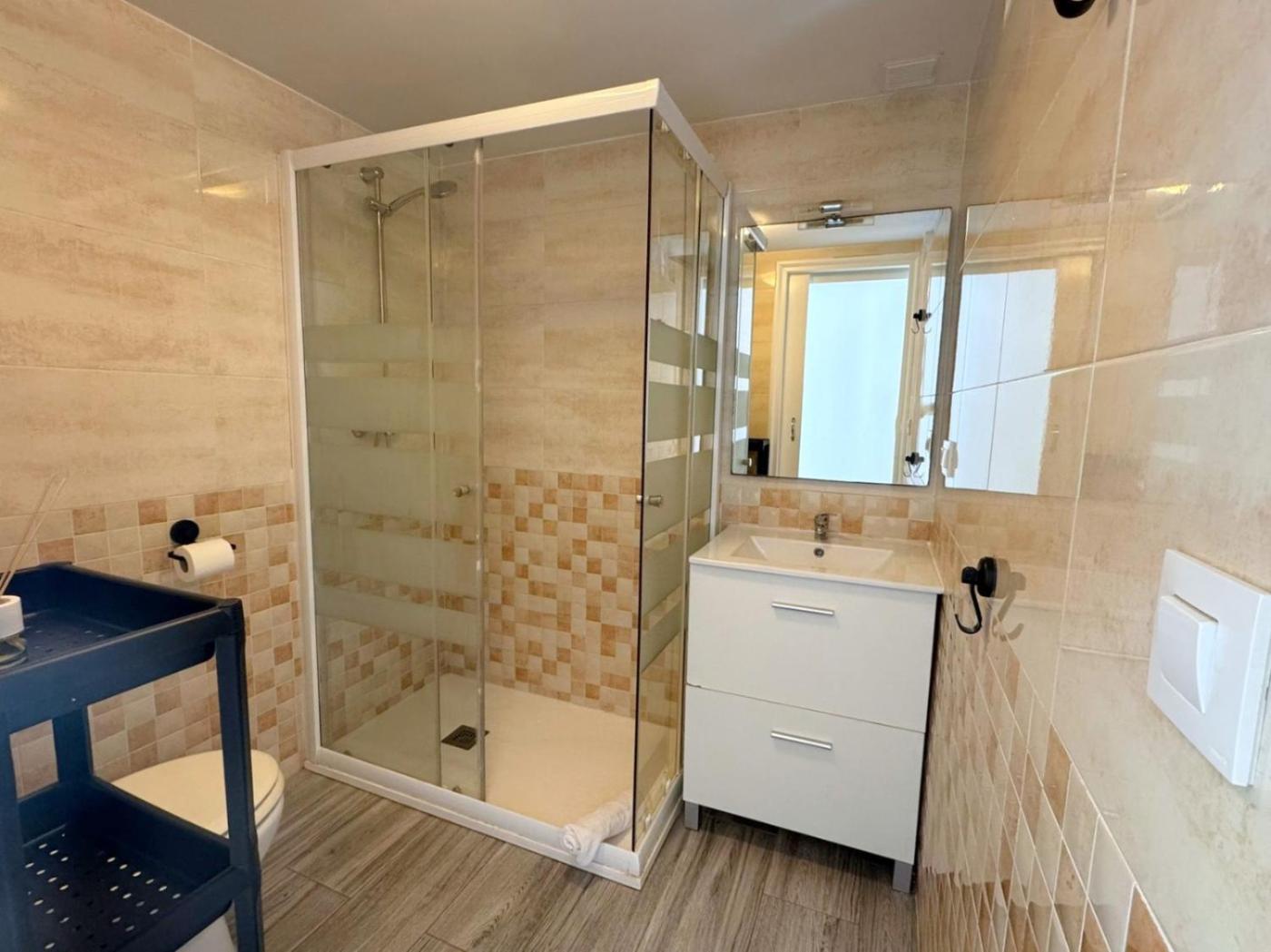 Studio Apartment with Sea View. Boasting a private entrance, this air-conditioned apartment comes with 1 living room, 1 separate bedroom and 1 bathroom with a walk-in shower. Guests can make meals in the kitchen that features a stovetop, a refrigerator, kitchenware and a microwave. The apartment features a flat-screen TV, a washing machine, a coffee machine, a dining area as well as sea views. The unit has 1 bed.